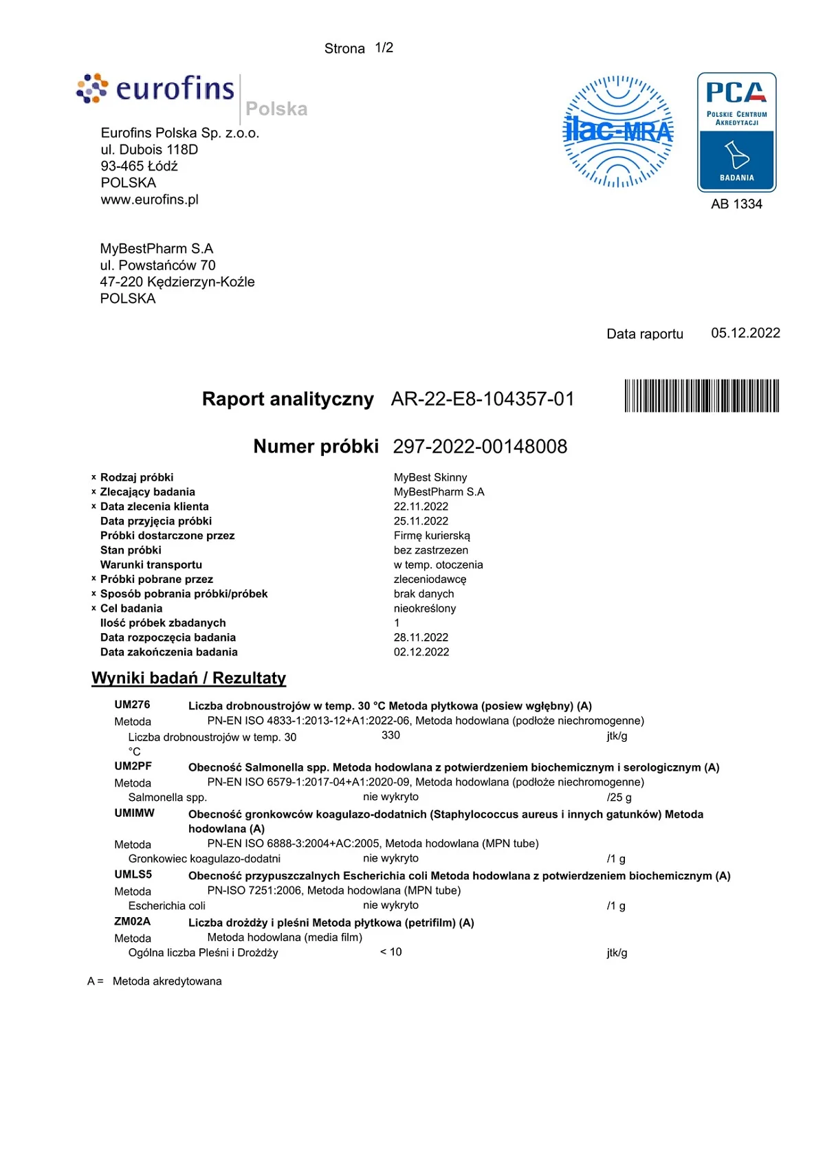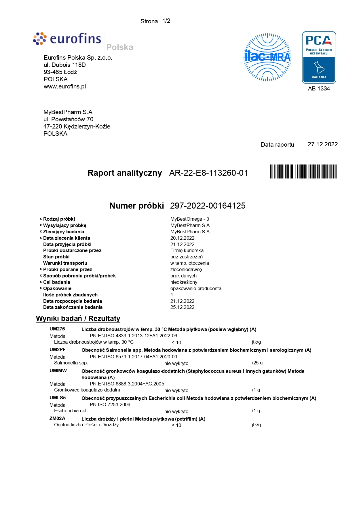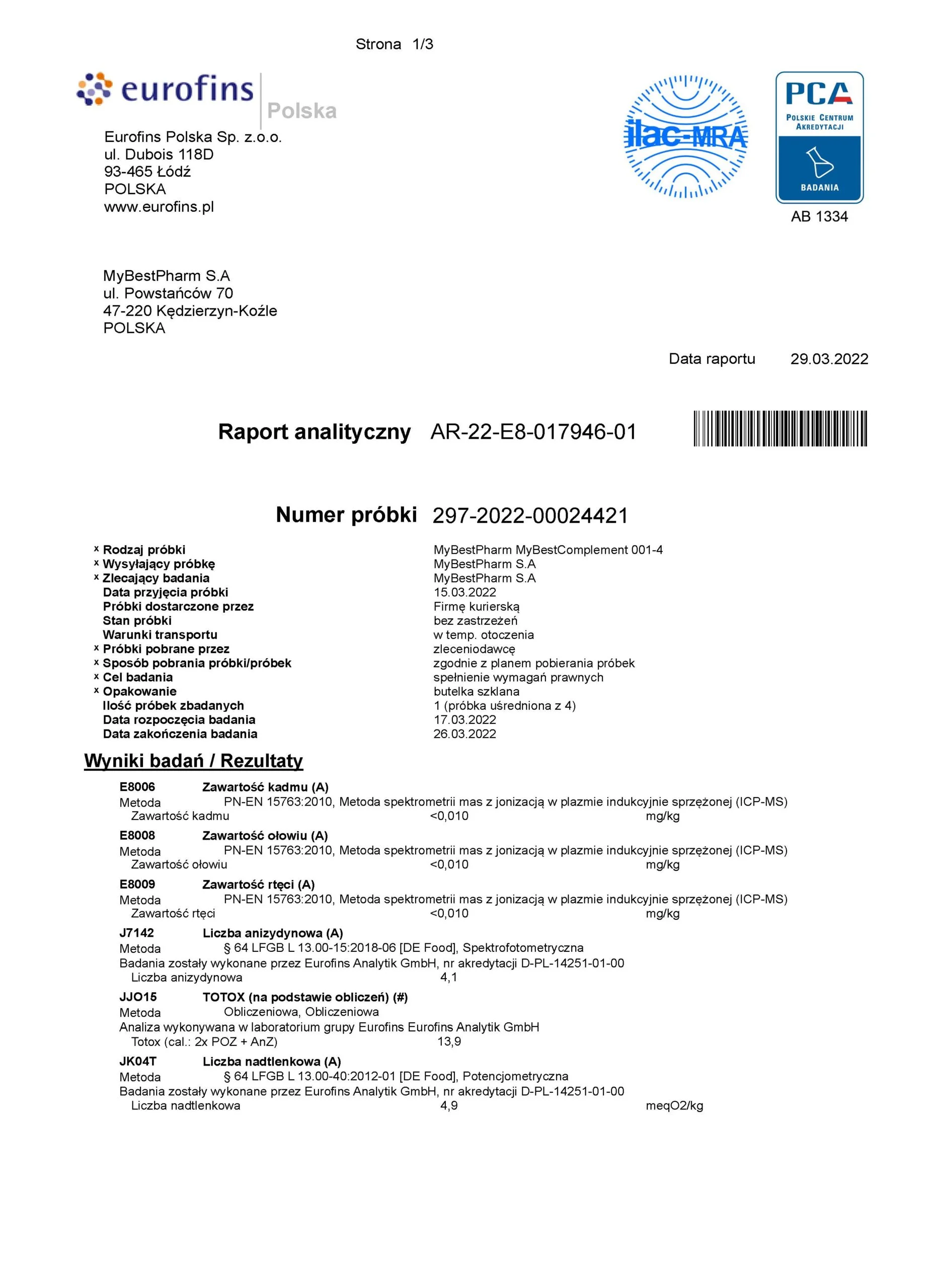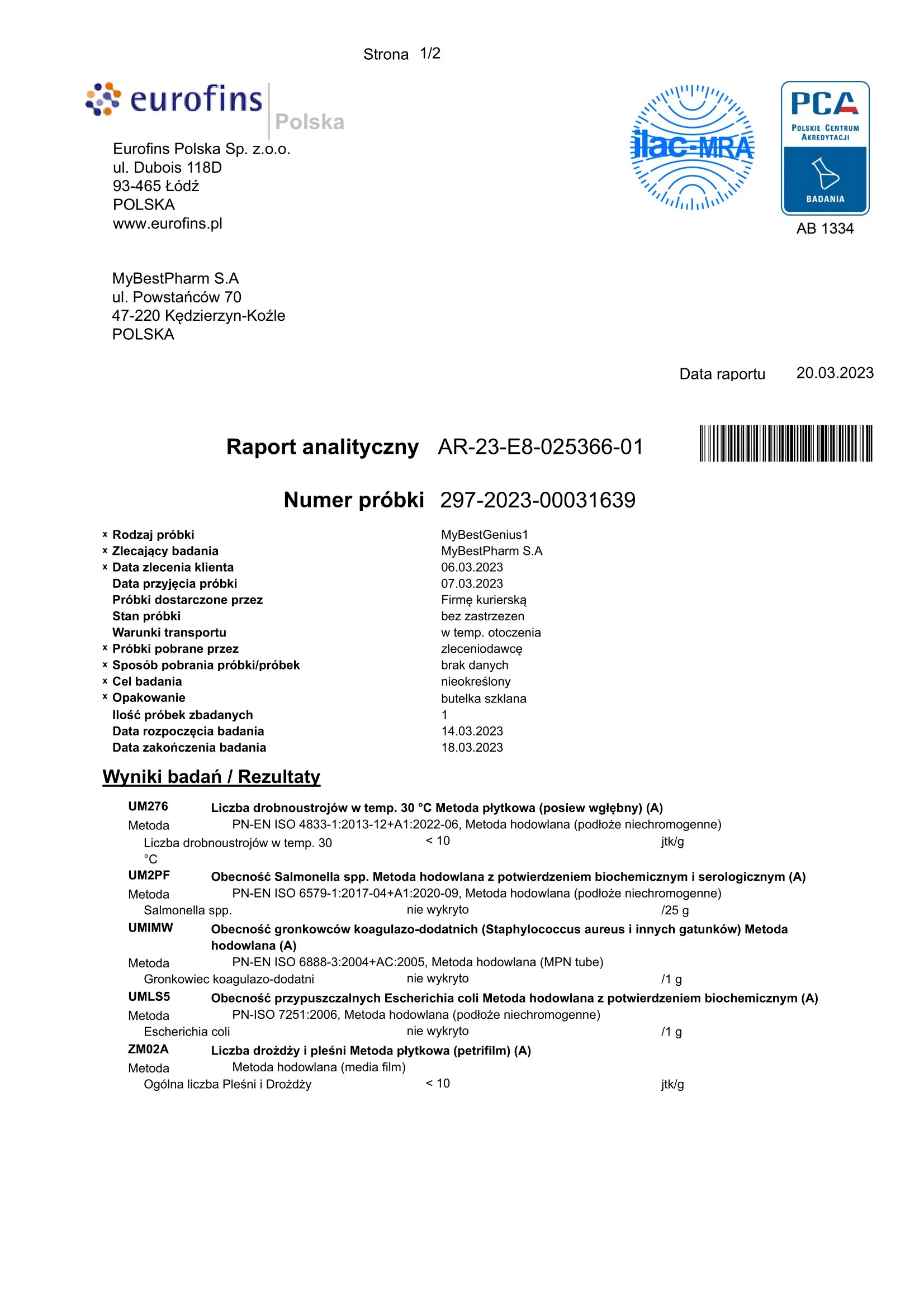 Nasze suplementy poddajemy regularnej kontroli pod kątem czystości mikrobiologicznej oraz braku zawartości metali ciężkich. Badania przeprowadzane są przez niezależne i akredytowane laboratorium Eurofins Polska, a uzyskane wyniki świadczą o zachowaniu najwyższej jakości składu naszych preparatów.