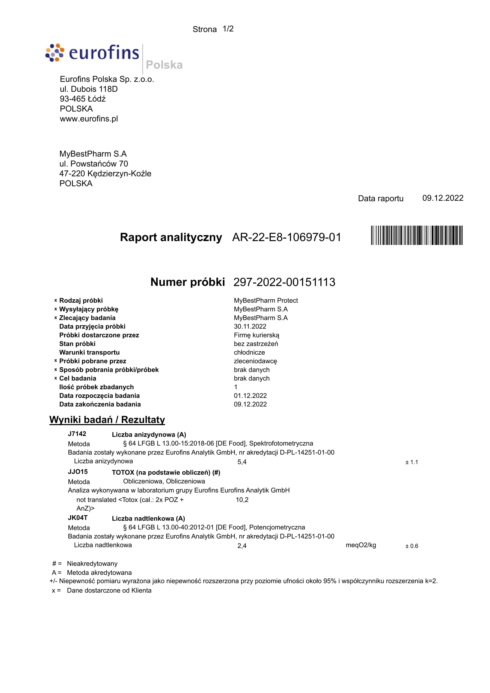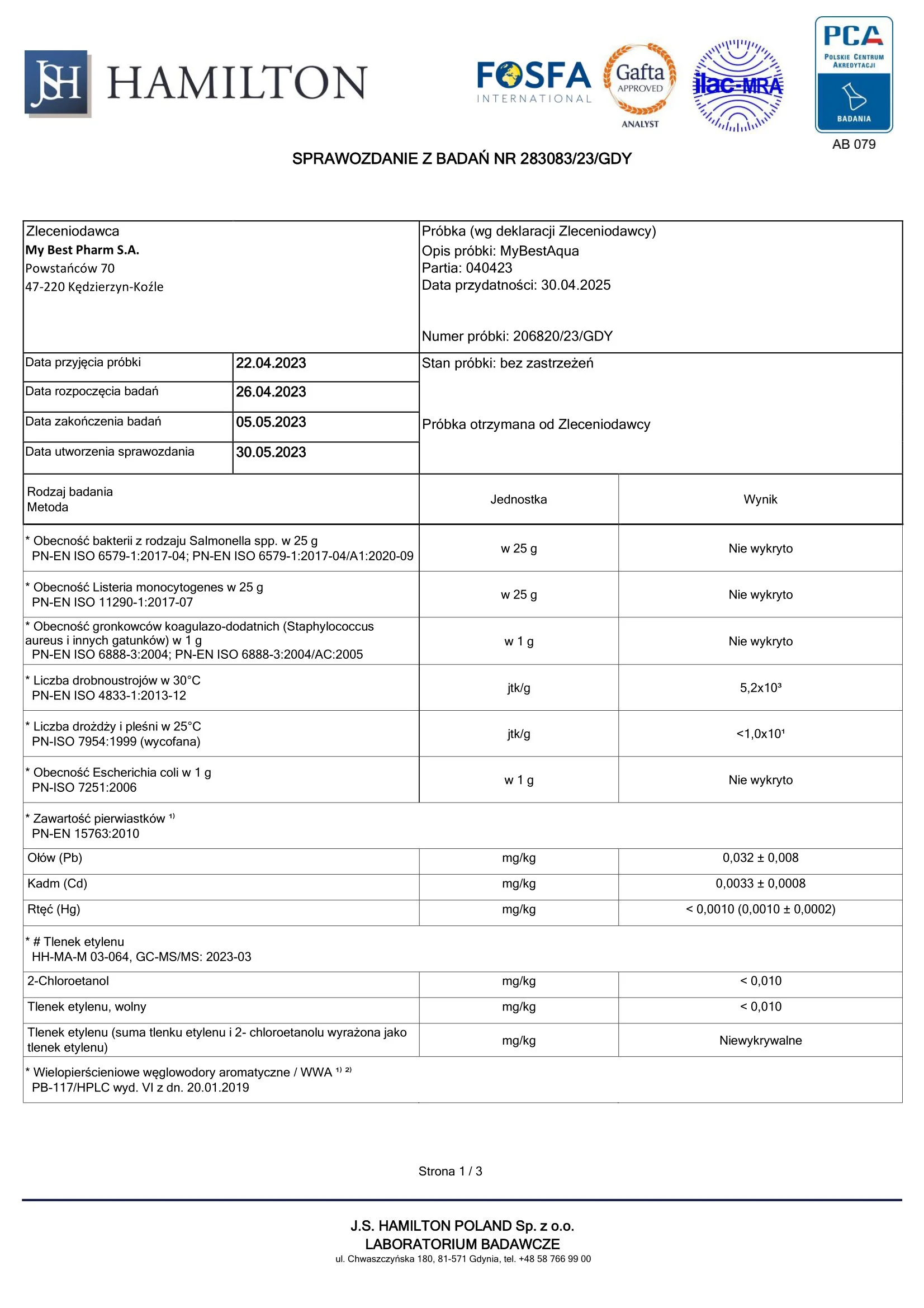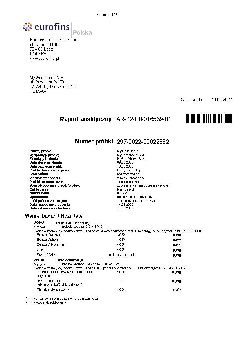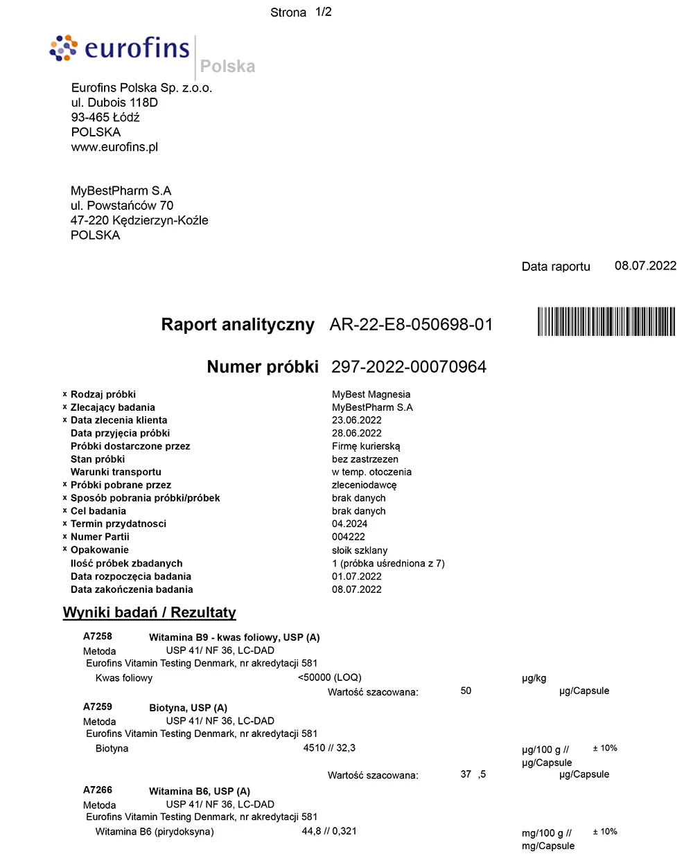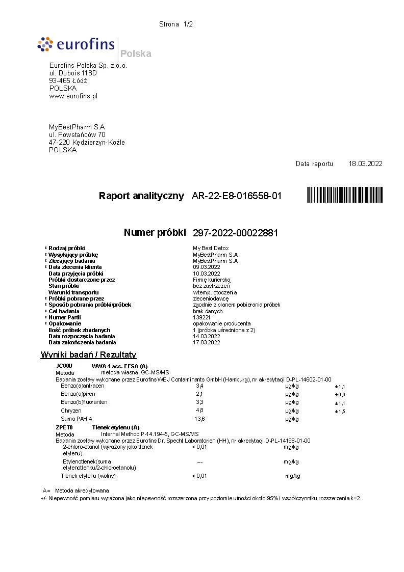 Nasze suplementy poddajemy regularnej kontroli pod kątem czystości mikrobiologicznej oraz braku zawartości metali ciężkich. Badania przeprowadzane są przez niezależne i akredytowane laboratorium Eurofins Polska, a uzyskane wyniki świadczą o zachowaniu najwyższej jakości składu naszych preparatów.