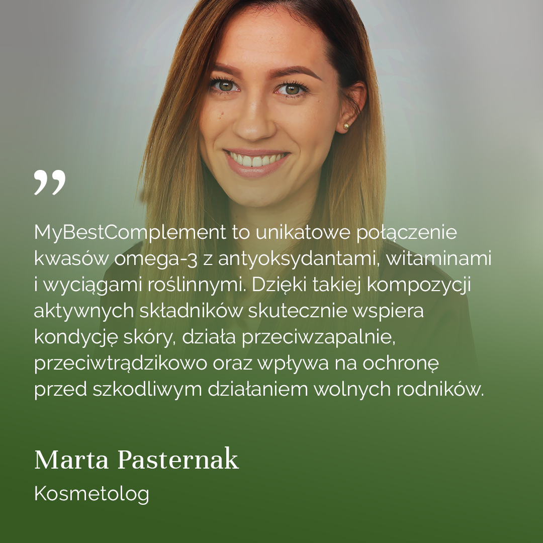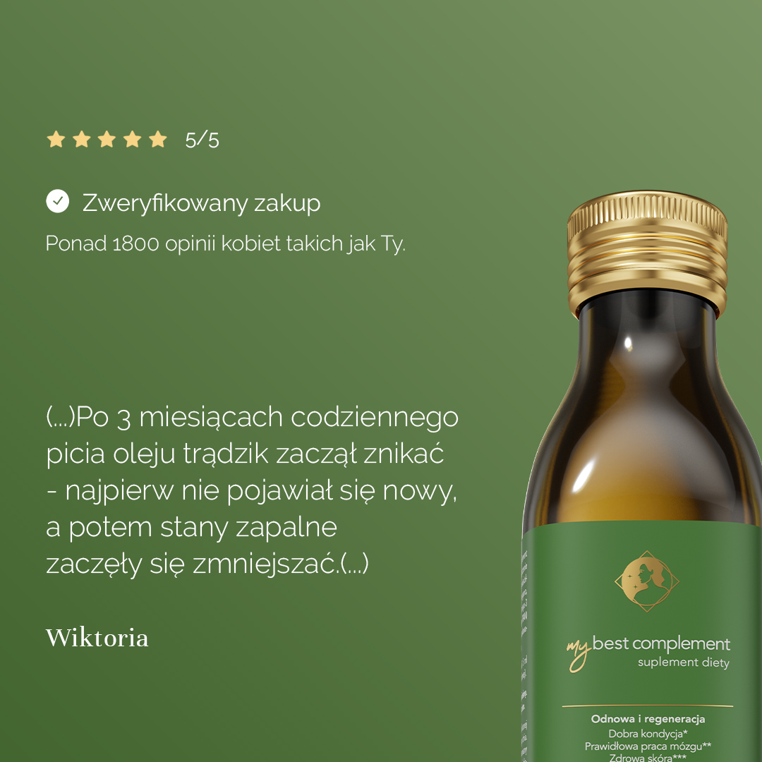 „Olej MyBestComplement to skuteczne i wygodne połączenie olejów roślinnych o działaniu przeciwzapalnym i kwasów omega 3 o prawidłowej wartości TOTOX. Stosowanie go jest ważnym elementem codziennej diety we wsparciu dolegliwości bólowych oraz silnego działania przeciwzapalnego, który ma kluczowy wpływ na rozwój endometriozy. Zawiera wysokiej jakości składniki odżywcze, dzięki metodzie obróbki na zimno. Posiada pozytywną opinię GIS i badania jakości dotyczące składu wydane przez niezależne Laboratorium EUROFINS. Został również przebadany na zawartość metali ciężkich takich jak kadm, ołów i rtęć.”