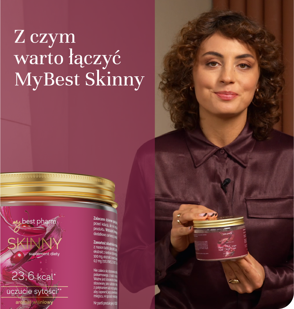 MyBestSlim i MyBestSkinny to produkty wspierające odchudzanie, ale działają w inny sposób. Możesz suplementować je wspólnie lub wybrać ten, który bardziej odpowiada Twoim potrzebom. MyBestSlim jest w formie kapsułek, wspiera odchudzanie na 5 poziomach wpływając na: zmniejszenie apetytu, przyspieszenie spalania tłuszczu, poprawę metabolizmu, zmniejszenie ochoty na słodycze, redukcję tkanki tłuszczowej. MyBestSkinny rozpuszcza się w wodzie. Działa natychmiastowo, dając poczucie sytości. Pozytywnie wpływa na perystaltykę jelit i wzdęcia.