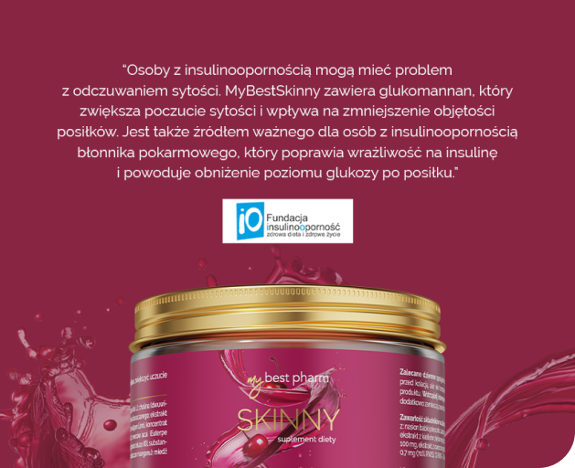 “Osoby z insulinoopornością mogą mieć problem z odczuwaniem sytości. MyBestSkinny zawiera glukomannan, który zwiększa poczucie sytości i wpływa na zmniejszenie objętości posiłków. Jest także źródłem ważnego dla osób z insulinoopornością błonnika pokarmowego, który poprawia wrażliwość na insulinę i powoduje obniżenie poziomu glukozy po posiłku.”