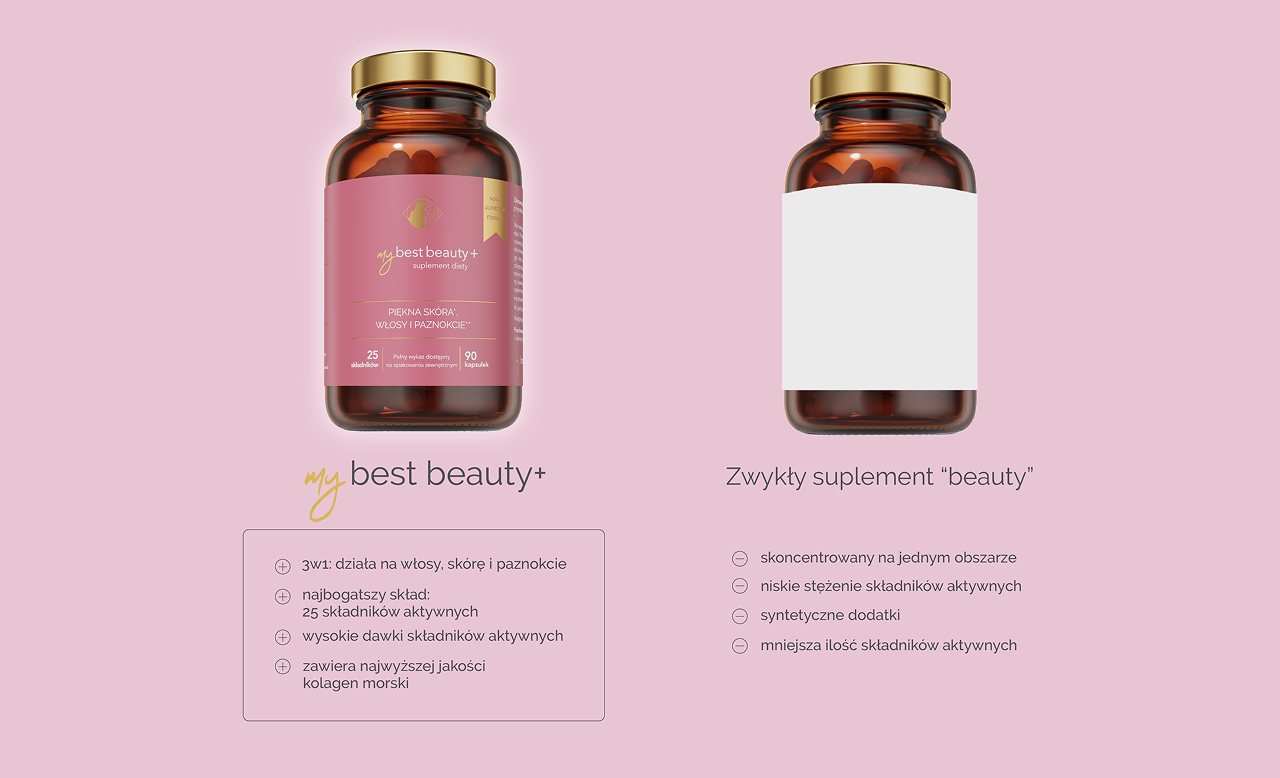 Receptura MyBestBeauty+ zawiera aż 25 składników aktywnych – każdy ma istotne znaczenie w metabolizmie i korzystny wpływ na strukturę oraz dobrą kondycję skóry, włosów i paznokci. Żaden z preparatów „beauty” dostępnych na rynku nie ma tak bogatej receptury w składniki roślinne, mineralne, witaminy, aminokwasy i ochronne antyoksydanty.