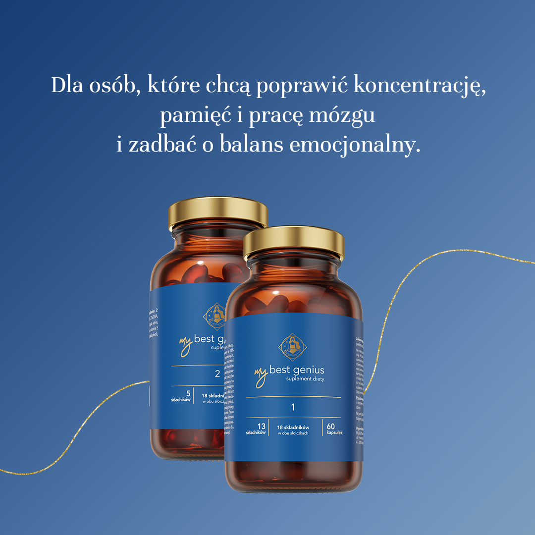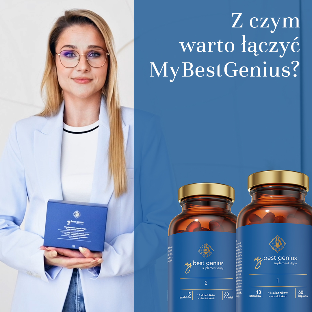 MyBestGenius powstał m.in. właśnie dla takich osób, które uczą się, studiują, zdają egzaminy, dla osób, które potrzebują swojej maksymalnej efektywności mózgu i działania. W MyBestGenius znajduje się wiele substancji mających pozytywny wpływ na funkcje mózgu, koncentrację, czujność, zdolności poznawcze, ostrość wzroku, wytrzymałość fizyczną i psychiczną. A wszystkie te funkcje są niezbędne do prawidłowej nauki, pracy mózgu, poznawania wiedzy i wykorzystania ich podczas egzaminów, kolokwiów. Np. DHA (z kwasów omega-3 z MyBestGenius 2) wspiera prawidłowe funkcjonowanie mózgu i wzroku, żeń-szeń pomaga w utrzymaniu optymalnej wytrzymałości, witalności, dobrego samopoczucia fizycznego i psychicznego. Dodatkowo różeniec górski, bakopa drobnolistna, witania ospała (ashwaganda), ginko biloba, cynk, tiamina, witamina B12, wąkrotka azjatycka (gotu kola) z MyBestGenius 2 wspierają prawidłową pracę mózgu.