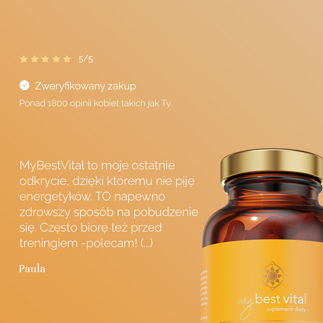 Stosując pełną dawkę MyBestVital, można pić około 2 filiżanki kawy dziennie. Bezpieczna dawka kofeiny dla zdrowej osoby dorosłej to 400 miligramów. Przeciętna filiżanka kawy zawiera 70-110 miligramów kofeiny – w zależności od rodzaju kawy, techniki parzenia, ilości zużytej do zaparzania. MyBestVital zawiera 85 miligramów kofeiny (o szybkim uwalnianiu) i 37,5 miligramów kofeiny z Guarany (o wolnym uwalnianiu). Stosując w pełnych dawkach MyBestVital oraz MyBestSlim, który zawiera 80 miligramów kofeiny z guarany, zaleca się ograniczyć kawę do jednej filiżanki dziennie.